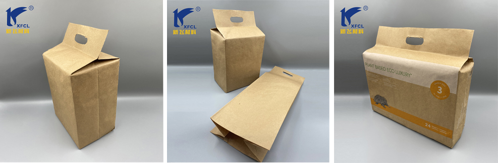 Este envase de papel biodegradable sin plástico se utiliza ampliamente en la industria de la higiene, como en el envasado de toallas sanitarias, pañuelos desechables, pañales, bragas menstruales, etc. A continuación se muestra una muestra de un envase de prueba de pañales.