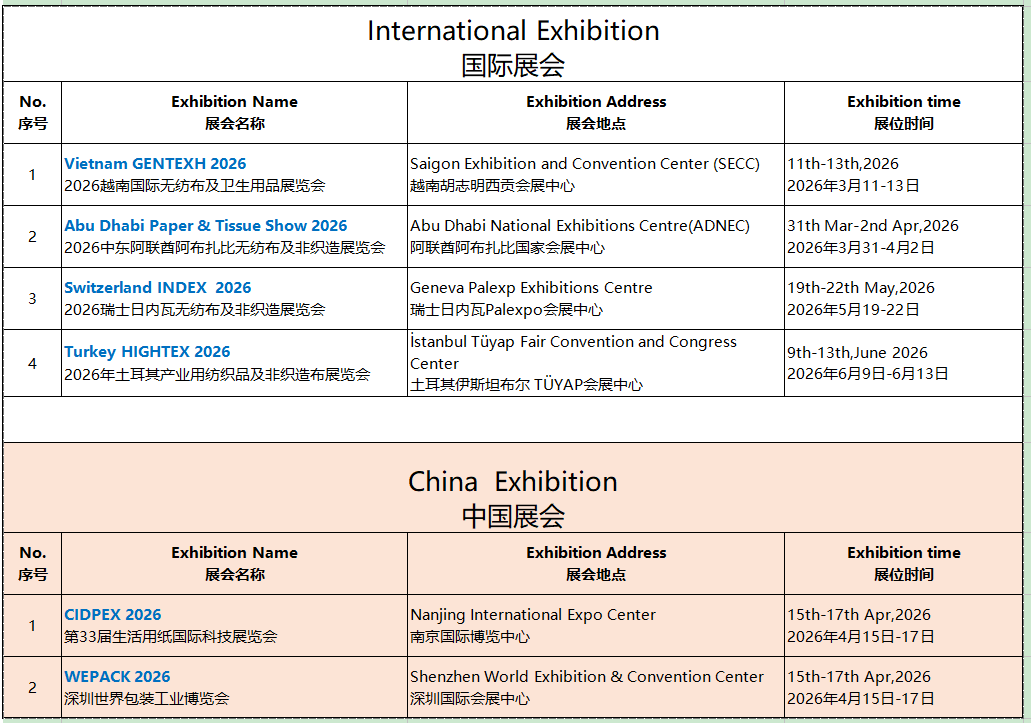 Exposiciones internacionales: Vietnam GENTEXH 2026, Feria de papel y pañuelos de Abu Dabi 2026, Suiza INDEX 2026, Turquía HIGHTEX 2026